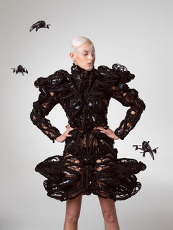 Maartje Dijkstra (1982) is a Dutch fashion designer that is studio based in Rotterdam TheNetherlands. She studied at ARTEZ Arnhem (NL) where she graduated in Fashion Design. She did an internship at the company of Alexander McQueen in London, where her interests in couture developed. In 2008 she started her couture and technology label, where she designs innovative, sculptural and highly detailed fashion collections, jewelry pieces and sculptural designed couture, combined with integrated technologies that interact with electronic music. An important element within her work is that she merges delicate hand-executed materials and techniques with innovative technologies to maintain an individualistic style. A technique she developed is ‘manual 3D printing’, meaning using a 3D printer pen as a progressive tool to create unique fabrics. Also a signature within her label are the unique and bombastic shapes in design and sferical styling elements. To be able to create she uses the power of her own imagination, complexity in nature and loud/fast/dark electronic music as her biggest inspiration sources. When creating interactive designs she often works together with music producer Newk because he captures the perfect atmosphere in sound and has the same style and complex mindset as her when producing.